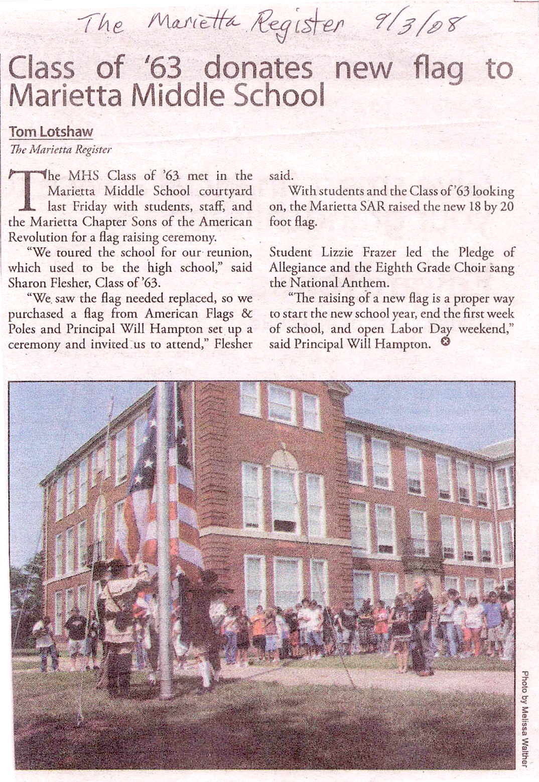 Floor: Bob Hausser, Jerri Stehle Jahn, Steven Weber, Ken Godsey, Allan Close Seated: Sharon White Flesher, Mary Covey Kinnamen, Helen Drake Reynolds, George "Buddy" Dalton, Row 3: Jim Duty, Pat Rohrer Beeman, Treva Giffen Collins, Mary Darrah Dye, Bonnie Nixon Mathers, Row 4: David Conrath, Terry Congleton, Pat Vroom Fogel, Judy Fox Forbes, Tina Conrath Del Deo, Row 5: Richard "Bub" Burton, Nial Caltrider, Bob Partridge, John Dickey, Barry Fouss, John Curran Additional Photos from the 45th Reunion Click here for Marietta Times Article on the donation of a new flag by the MHS Class of 1963. Click here for Marietta Register Article on the donation of a new flag by the MHS Class of 1963.